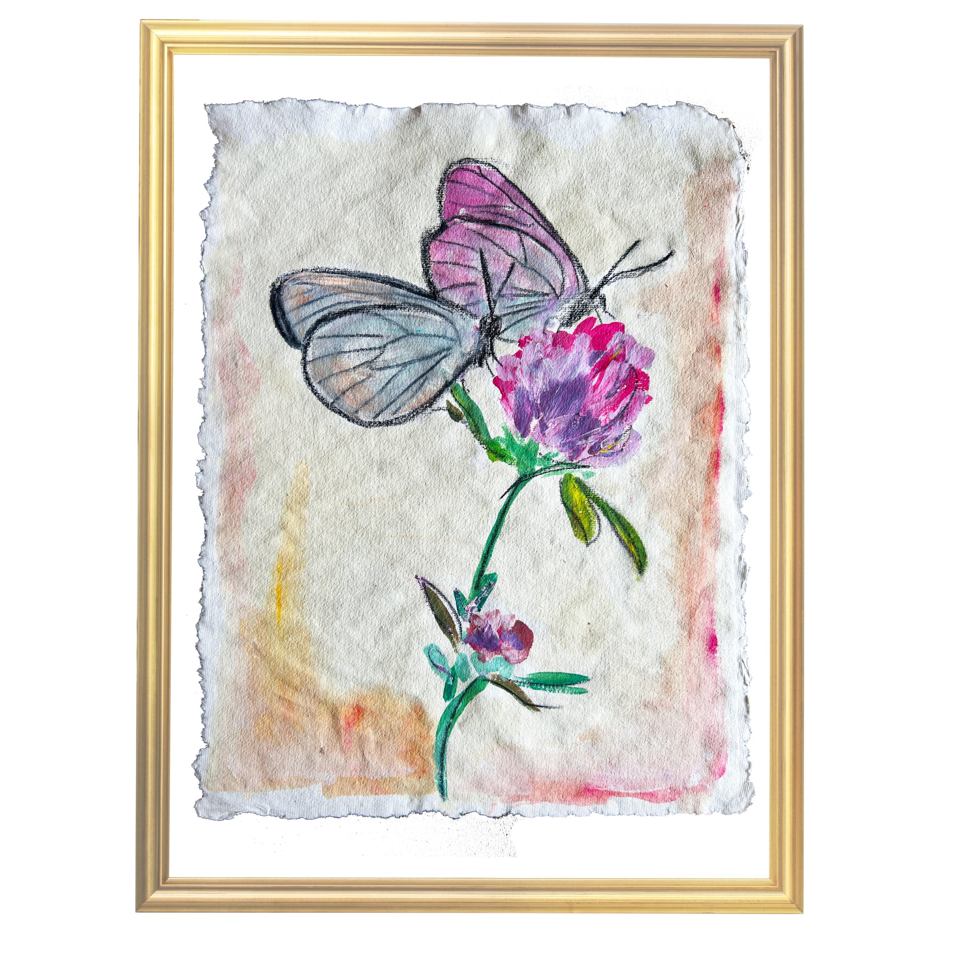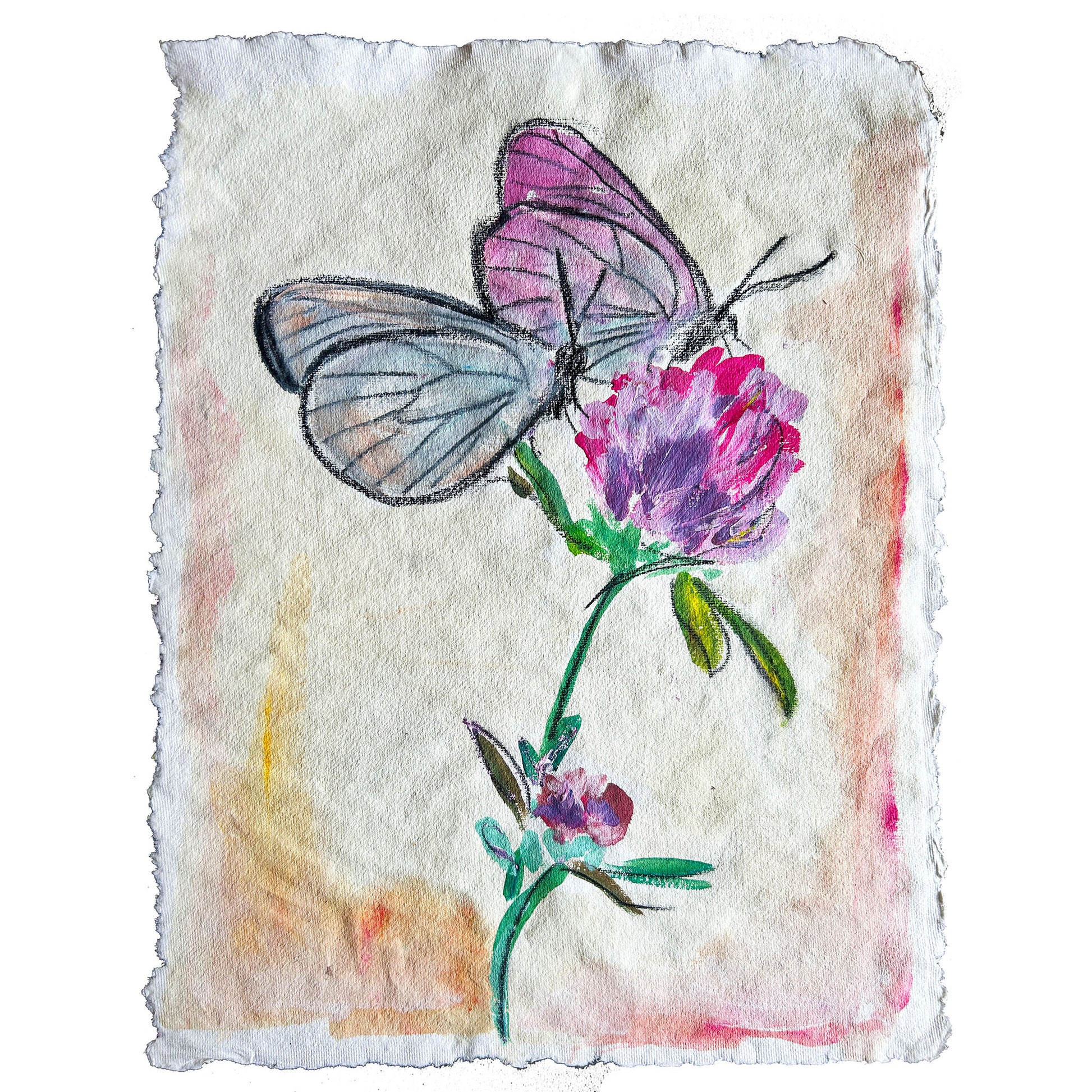 Enchant your space with this captivating painting of purple flowers and two delicate butterflies. Created in 2024 by Vestavia Hills artist Natalie Zoghby, this 12x16-inch artwork features a harmonious blend of watercolor, acrylic paint, and chalk & oil pastels. Rendered on handmade paper with a natural light cream color and a unique deckle edge, this piece exudes both elegance and charm.